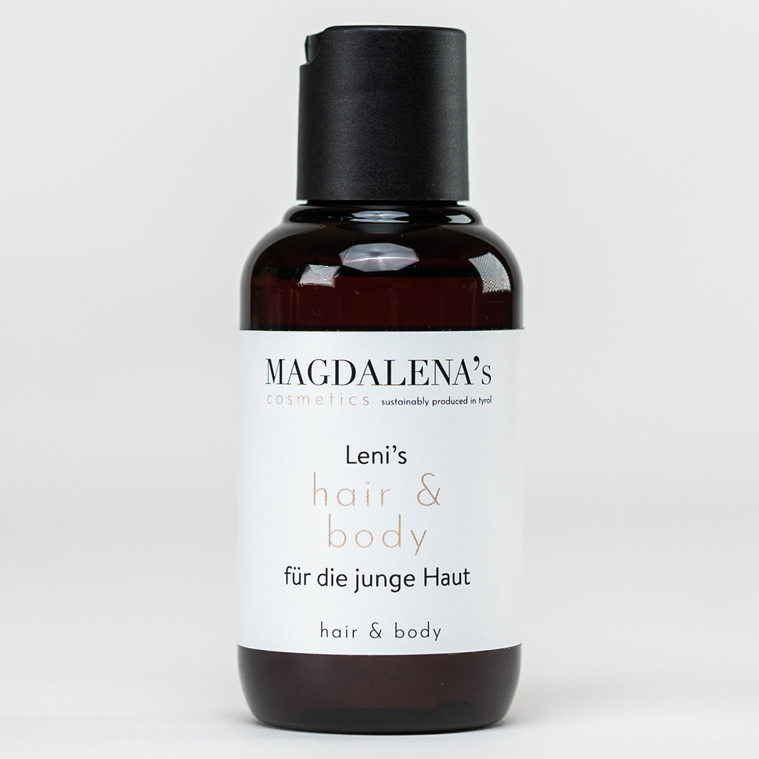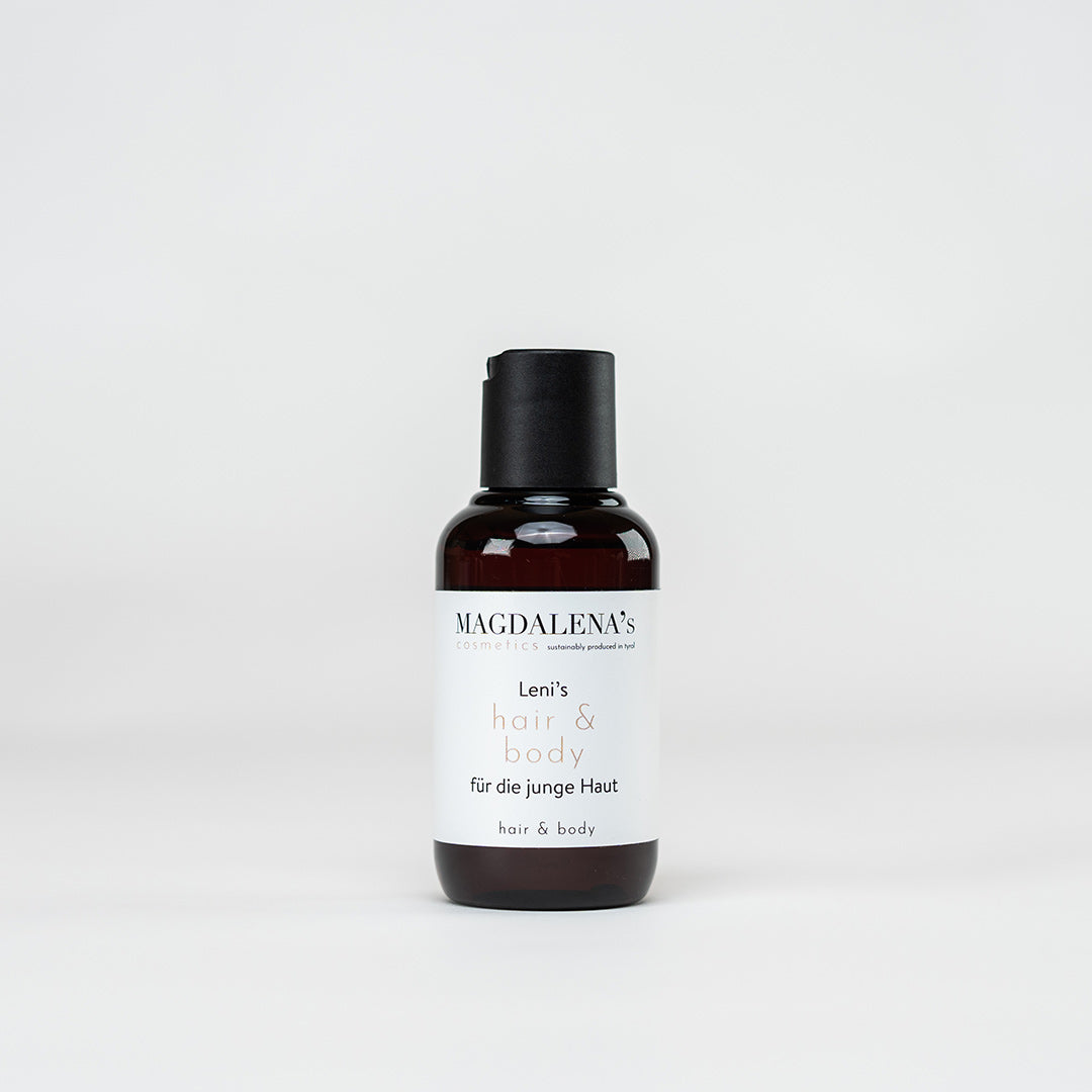 Voll genial, ganz ohne Chichi! Leni’s Hair & Body reinigt effektiv und hält trotzdem alles wunderbar im Gleichgewicht. Die leistungsstarke Rezeptur basiert auf supersanften, natürlichen Tensiden sowie feinen, hydrophilen und lipophilen Komponenten, die zart schäumend für Sauberkeit sorgen und gleichzeitig viel Feuchtigkeit und Pflege schenken. Kraftvolle Öle von Bergamotte und Grapefruit öffnen die Poren, beruhigen und klären. Extrakte aus wilder Kamille und Propolis lindern Irritationen, schenken Glanz und Geschmeidigkeit.