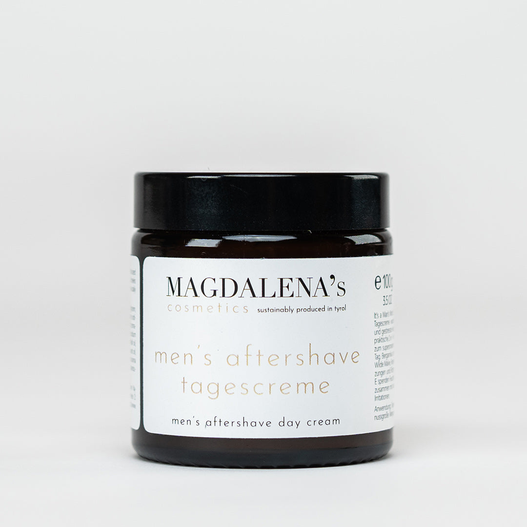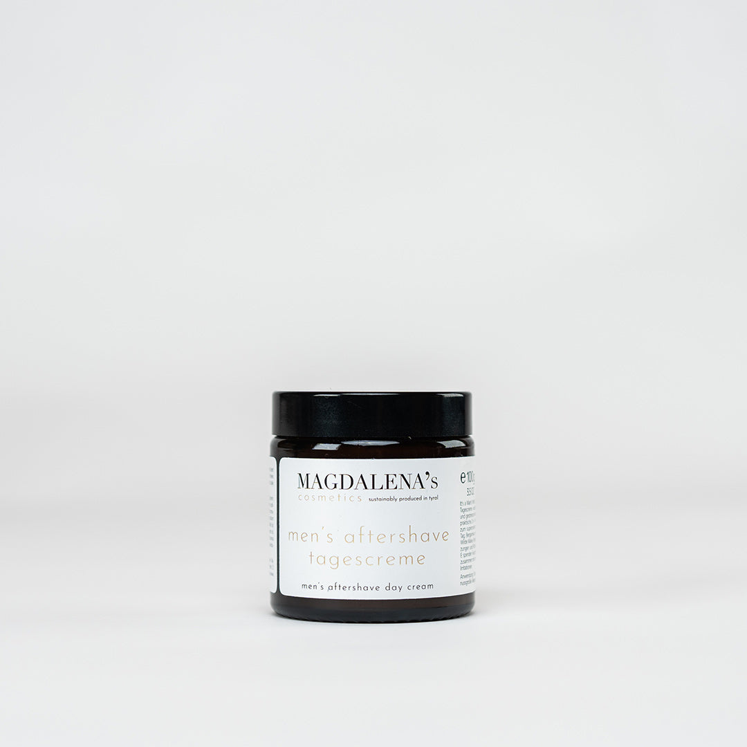 It's a Man's World ... Magdalena's Men's Aftershave Tagescreme wurde speziell für die empfindliche und gestresste Haut nach der Rasur entwickelt. Die praktische 2-in-1-Formel macht sie aber gleichzeitig zum supersmarten Hautpflegestar für den ganzen Tag. Bergarnika und Rosmarin kühlen und beleben, Wilde Malve, Ringelblume und Thymian lindern Reizungen und Rötungen, Hyaluronsäure und Vitamin E spenden Feuchtigkeit, regenerieren und beheben zusammen mit vitaminreichem Hagebutten-Extrakt Irritationen.
