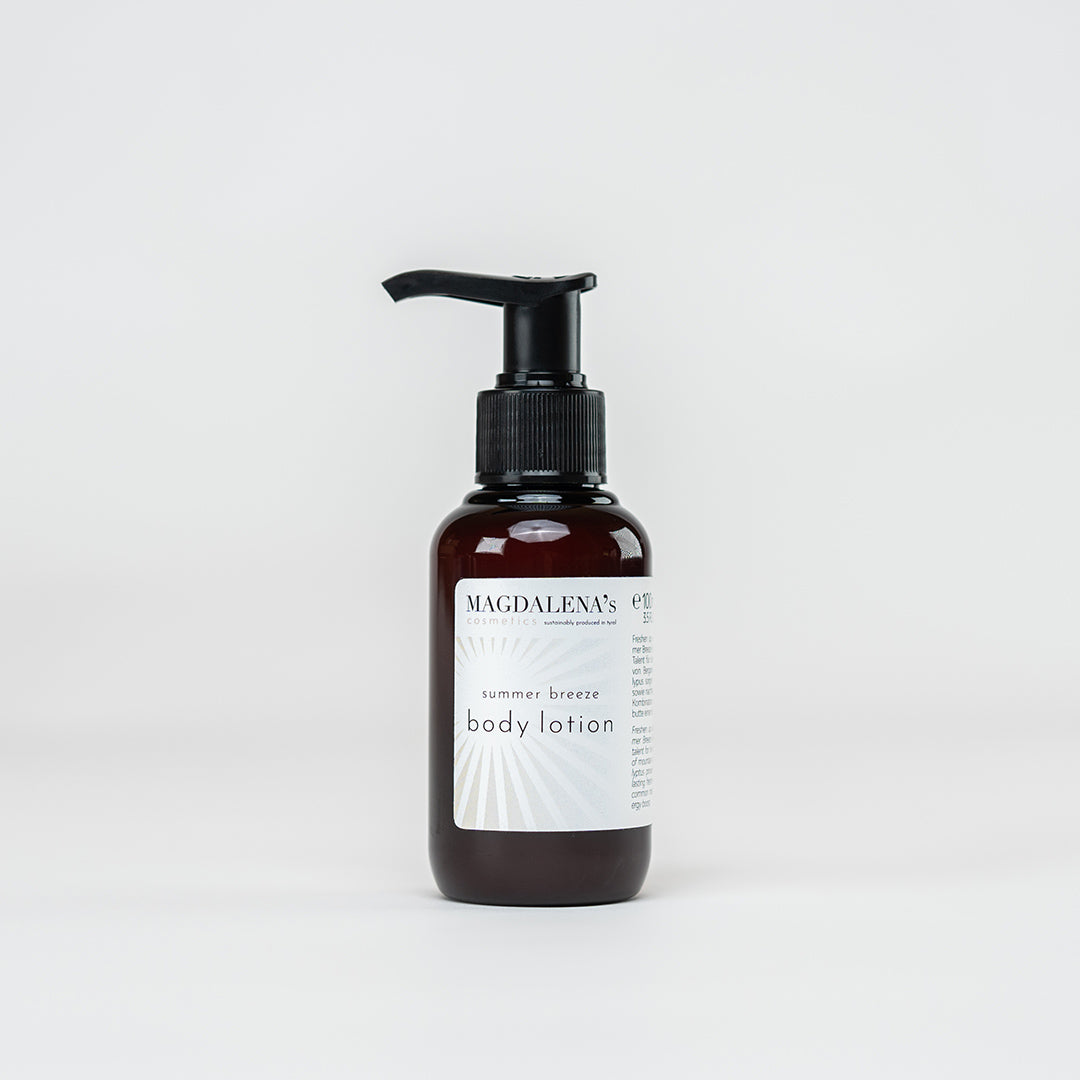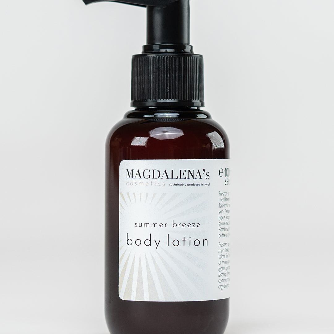 Fresh up your body! Magdalena's Summer Breeze Bodylotion ist ein Multitasking-Talent für lustvolle Sommertage. Essenzen von Bergarnika-Blüten und Zitronen-Eukalyptus sorgen für wohltuendes Cool-down sowie nachhaltige Frische und schenken in Kombination mit Wilder Malve und Hagebutte einen Energie-Kick.
