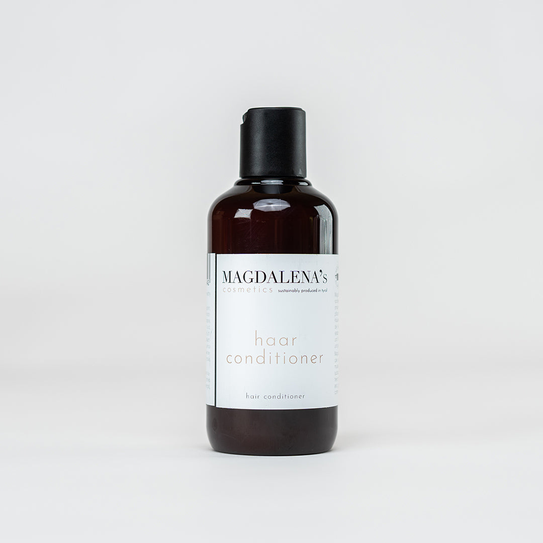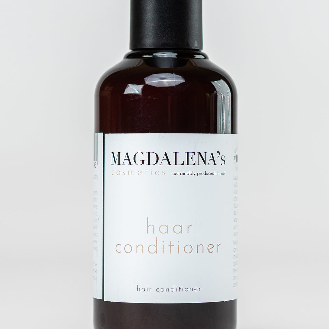 Magdalena's Haarconditioner spendet insbesondere strapaziertem Haar intensive Pflege. Die smarte Formulierung mit Olivenöl, wertvollen pflanzlichen Pflegesubstanzen und kraftvollen Kräuterextrakten stärkt Haar und Kopfhaut, glättet die Haarstruktur und verleiht neuen Glanz. Essenzen von Bergarnika, Wilder Malve, Hagebutte und Ringelblume sorgen für Regeneration, Kraft und gesunde Lebendigkeit.