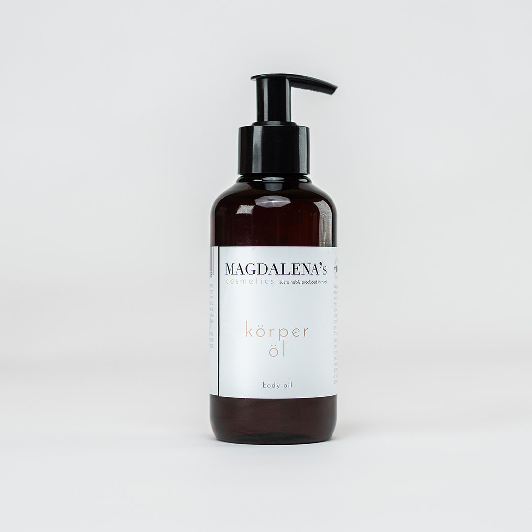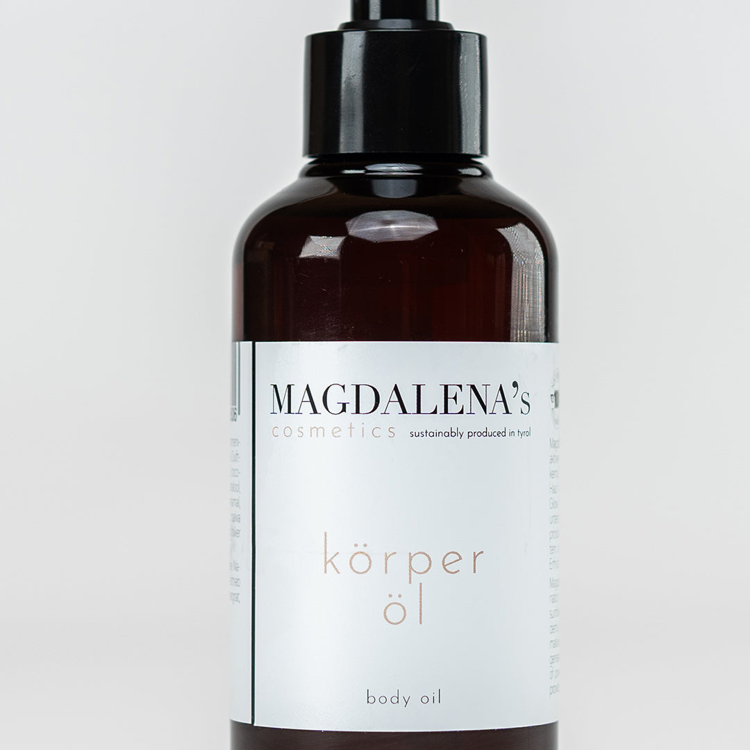 Magdalena's Körperöl verleiht mit seiner multiaktiven Kombination aus wertvollem Aprikosenkernöl, Olivenöl und Sonnenblumenextrakten der Haut wunderbare Geschmeidigkeit und einen vitalen Glow. Wilde Malve, Hagebutte und Ringelblume unterstützen die Hautregeneration und Kollagenproduktion. Ein Komplex aus kraftvollen Bergkräutern und Arnika-Essenzen sorgt für angenehme Erfrischung.
