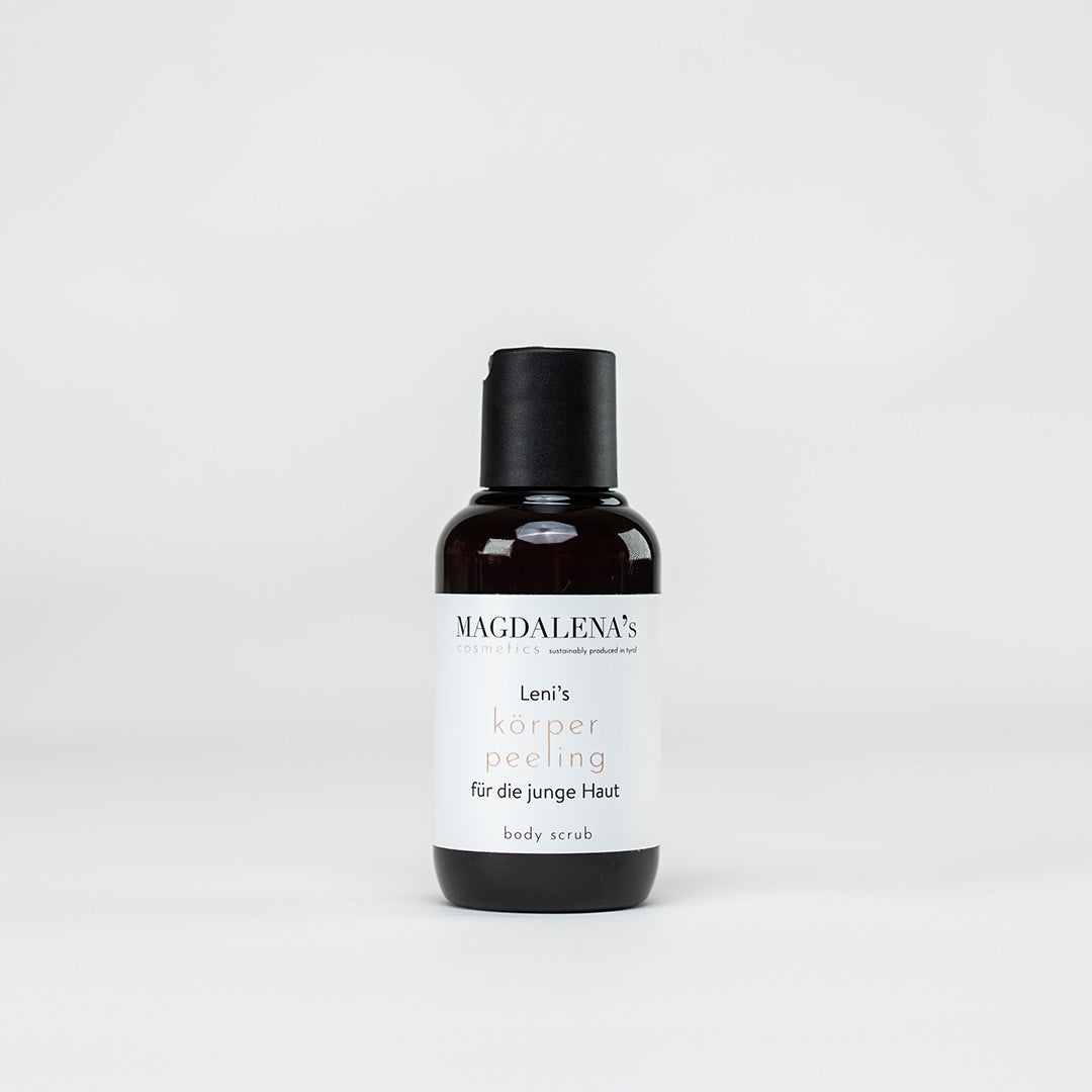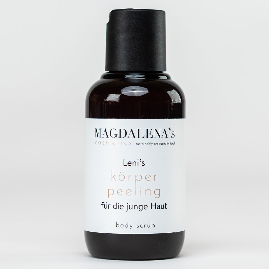 Manchmal braucht junge Haut mehr als nur eine sorgfältige Reinigung. Dann hat Lenis Körperpeeling seinen effektvollen Auftritt. Native, mit Vitaminen und Bioaktiva angereicherte Öle, feinst vermahlenes Pulver aus Aprikosenkernen und milde Fruchtsäure befreien die Poren, entfernen Unreinheiten, überschüssigen Talg und Hautschüppchen. Wirksame Extrakte von Wilder Kamille und Propolis beruhigen, klären und regenerieren auch gestresste Haut, machen sie superweich und sorgen für ein sichtbar ausgeglichenes, glattes und wohl auch strahlenderes Hautbild.