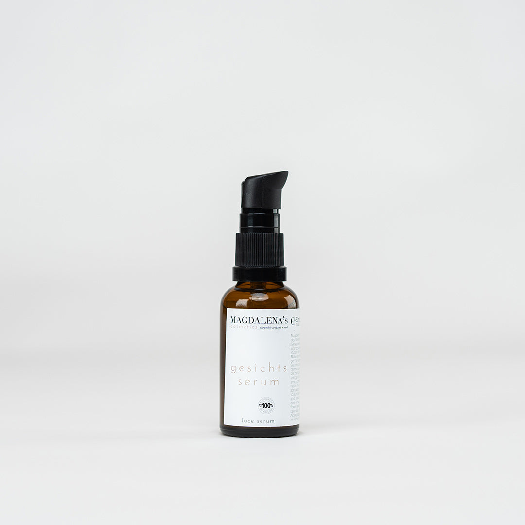 Magdalena's Serum ist ein klärendes und intensiv feuchtigkeitsspendendes Wirkstoffkonzentrat auf Basis eines multiaktiven Kräuterkomplexes, Gerstenextrakt und wertvollen Pflanzenlipiden. Die hochkonzentrierte pflanzliche Hyaluronsäure und energiereiches Hagebuttenextrakt unterstützen die Hautzellen bei der Feuchtigkeitsbindung. Bergarnika, Wilde Malve und Ringelblume beruhigen und unterstützen die Hautregeneration. Das Hautbild wirkt ausgeglichen, geglättet und erfrischt.
