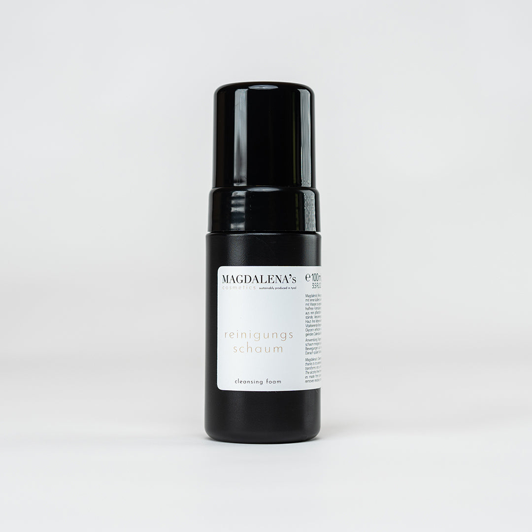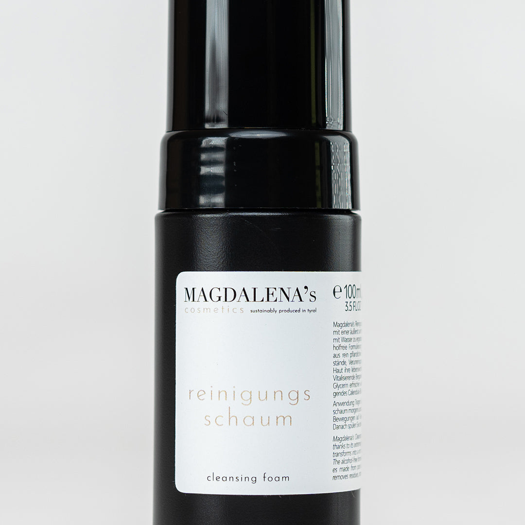 Magdalena's Reinigungsschaum begeistert die Haut mit einer äußerst sanften, cremigen Geltextur, die sich mit Wasser zu ergiebigem Schaum wandelt. Die alkoholfreie Formulierung mit waschaktiven Substanzen aus rein pflanzlichen Tensiden entfernt sanft Rückstände, Verunreinigungen und Ölpartikel, ohne der Haut ihre lebenswichtige Feuchtigkeit zu entziehen. Vitalisierende Bergarnika, Hagebutte und pflanzliches Glycerin erfrischen, während Wilde Malve und pflegendes Calendula-Blütenextrakt die Haut beruhigen.